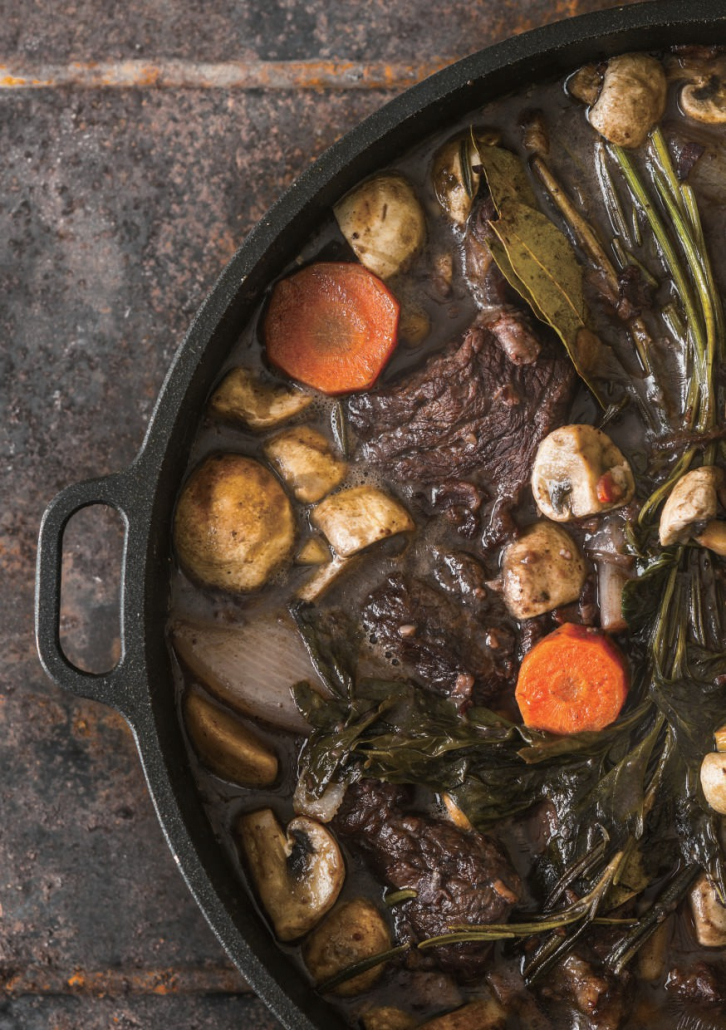 Насладете се на богато и ароматно говеждо, приготвено бавно с бекон, гъби и червено вино – перфектната вечеря за специални моменти.