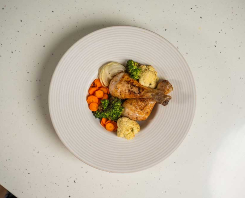 Пилешки бутчета с печени зеленчуци - съчетание от сочни пилешки бутчета и ароматни печени зеленчуци, приготвени за перфектна и изобилна вечеря.