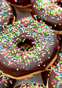 • Потопете горната част на поничките в шоколадовата смес, когато изстинат, украсете ги с поръска и ги оставете да стегнат за 30 минути, преди да ги поднесете.