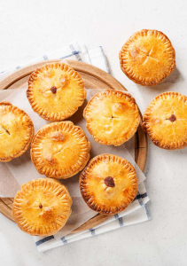 • Смесете яйцето и млякото, за да получите яйчен крем, и намажете с него горната част на всеки пай.