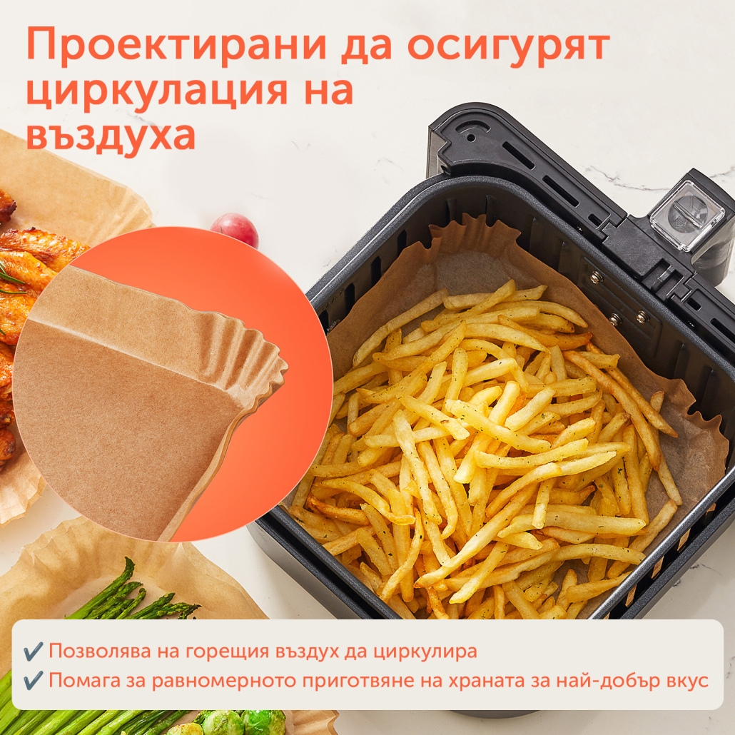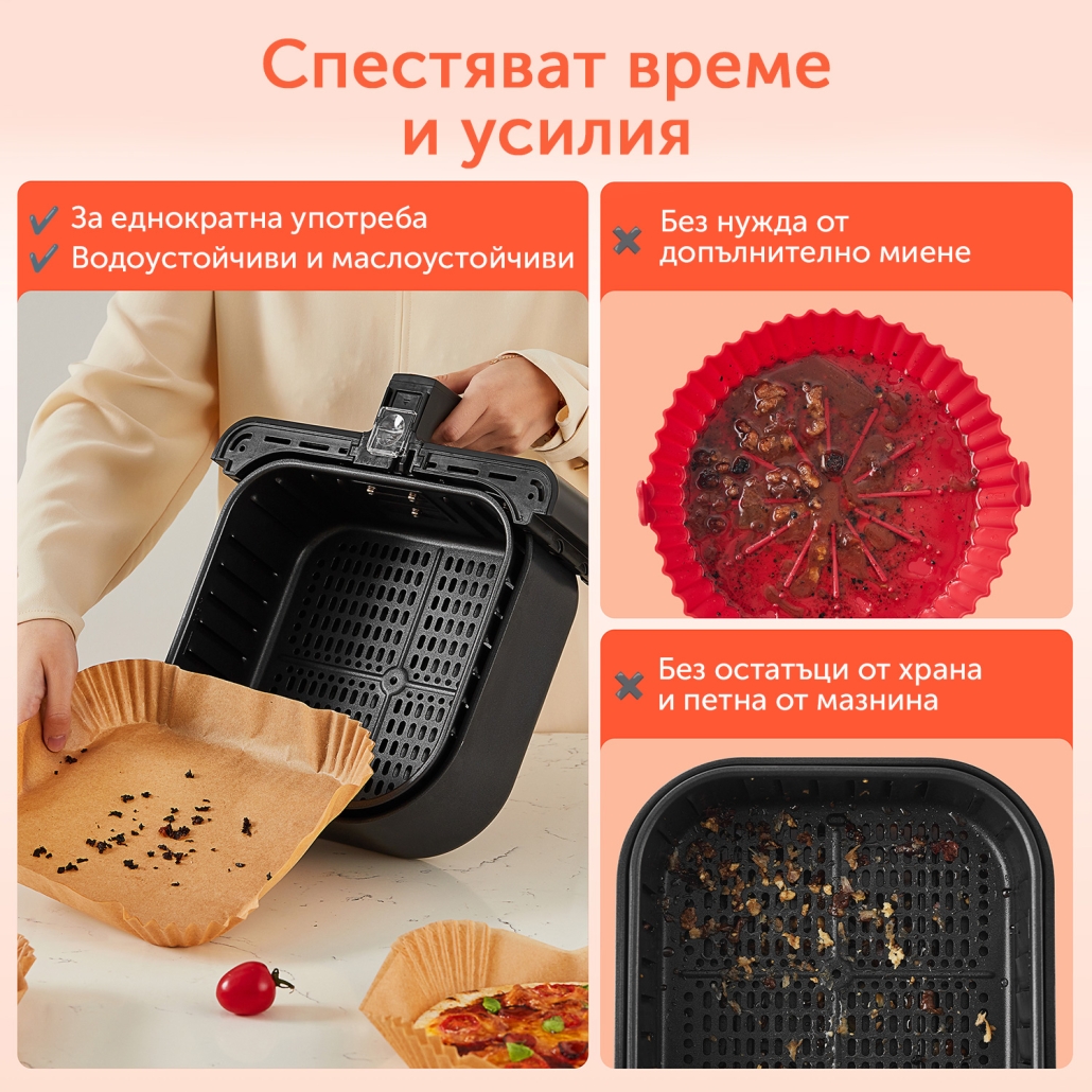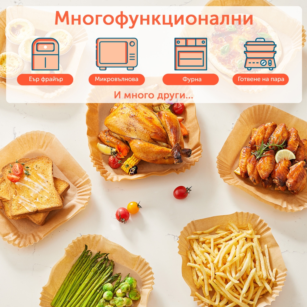 Хартиените подложки не са просто аксесоари за фритюрници с горещ въздух, а също така са подходящи за микровълнови фурни, фурни, уреди за готвене на пара и други. Всеки комплект включва 100 подложки, така че сте готови за барбекюта, празнични партита и приготвяне на домашни печива.
