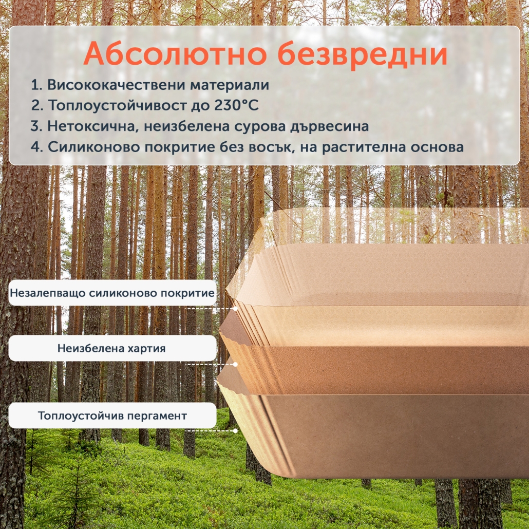 Подложките са изработени от безвосъчна, нетоксична и не избелена пергаментова хартия, която може да се нагрява до 230 ℃.