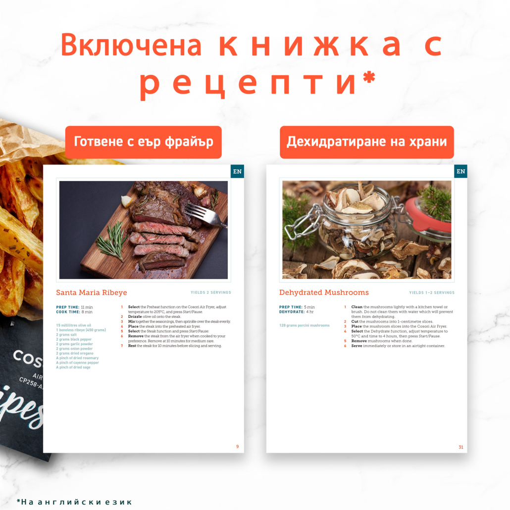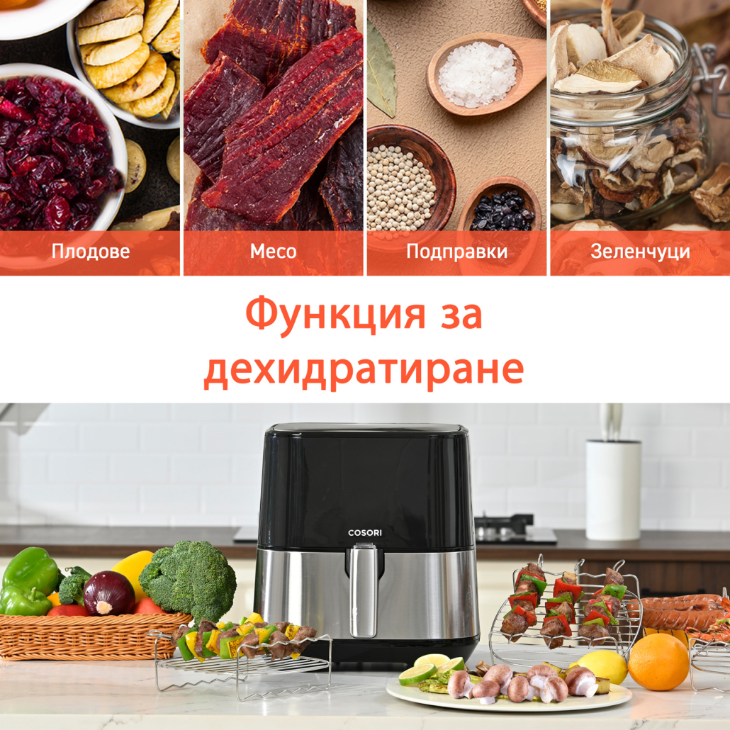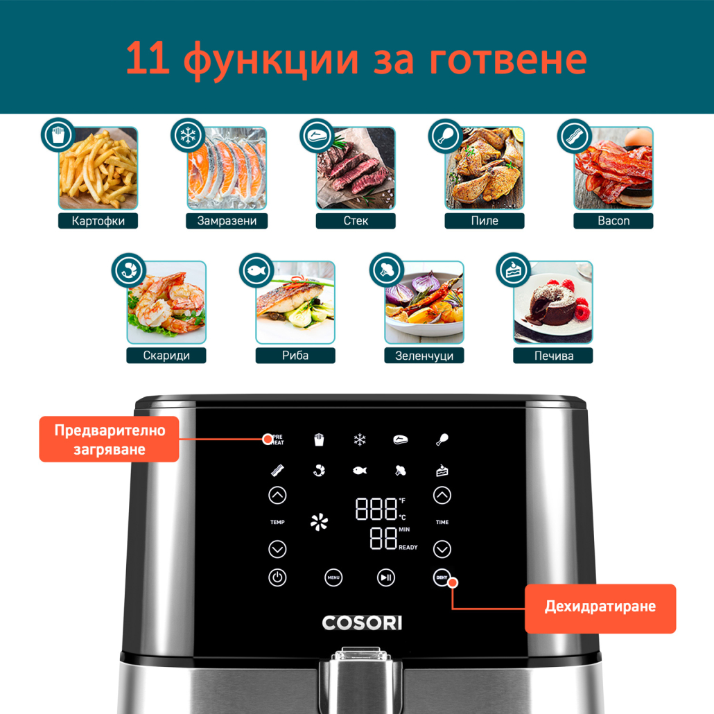 Програмите на Cosori ви дават възможност за предварителни настройки, разработени специално от майстор-готвачите на Cosori, което гарантира запомнящ се вкус на ястията. Функциите за дехидратация и предварително загряване, ви осигуряват изживяване в кухнята от нова висота.