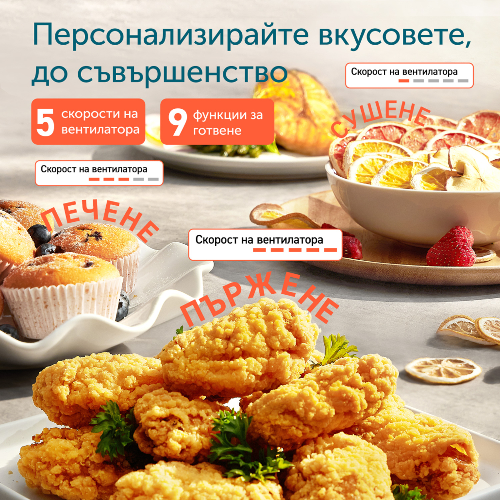 С технологията за бърза 360° циркулация на горещия въздух, ще се насладите на същата хрупкавост като при традиционното дълбоко пържене, но с до 95% по-малко мазнини.