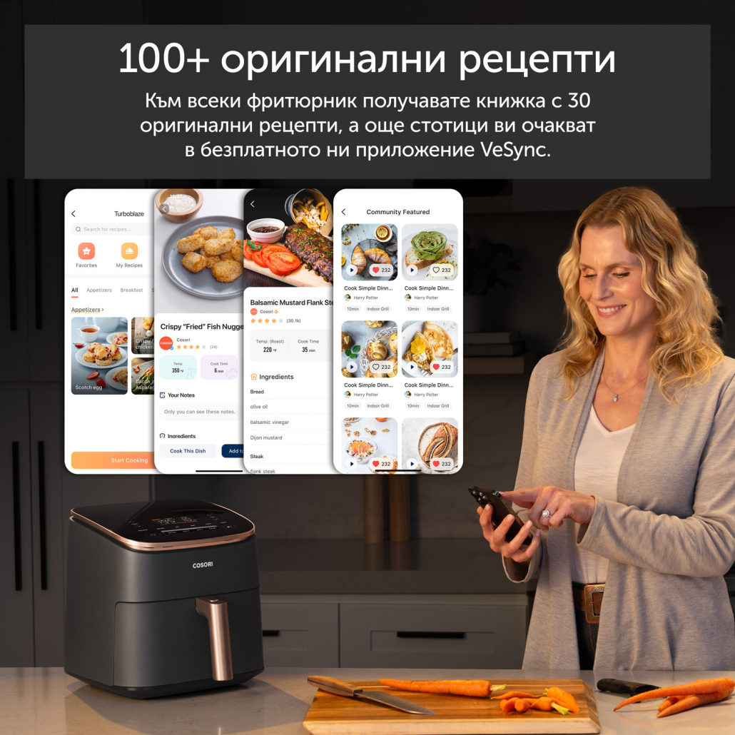 Намерете вдъхновение с над 100 рецепти в безплатното ни приложение VeSync. За кратко време ще започнете да готвите като професионалист. Изтеглете и онлайн книжка с рецепти тук.