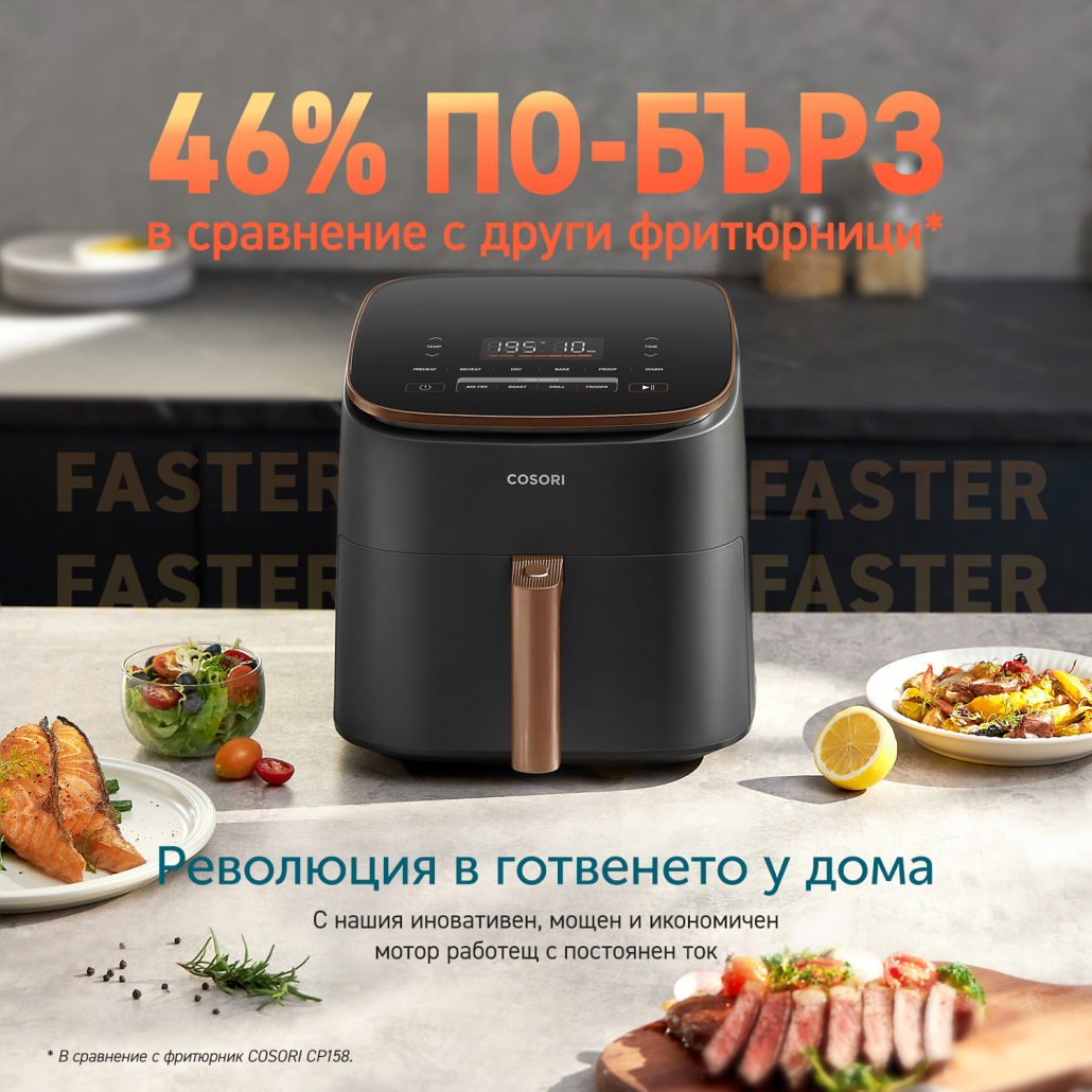 Благодарение на мотора работещ с постоянен ток, ефективността на Cosori TurboBlaze™ значително превъзхожда тази на стандартните фритюрници с горещ въздух, работещи с мотори на променлив ток. С TurboBlaze™ пестите енергия и време.