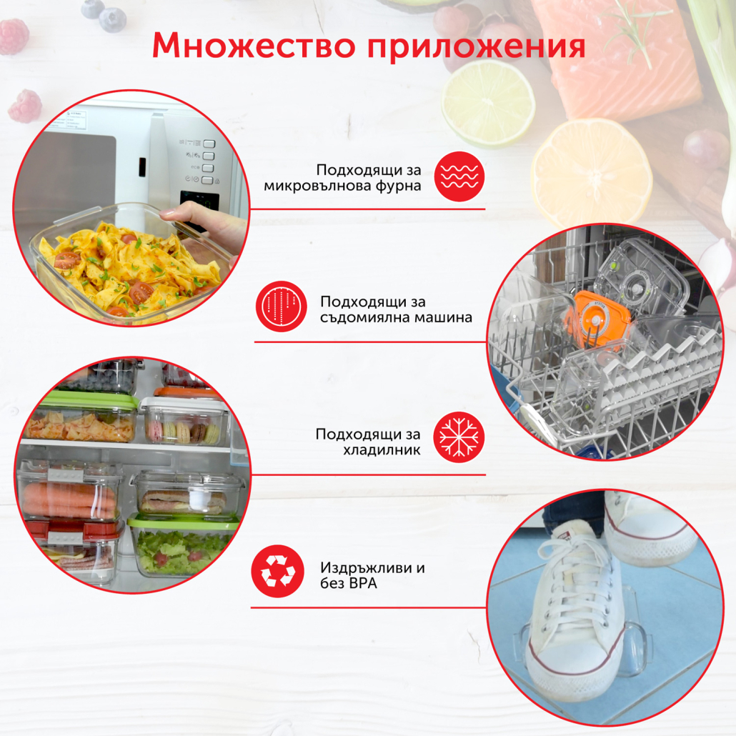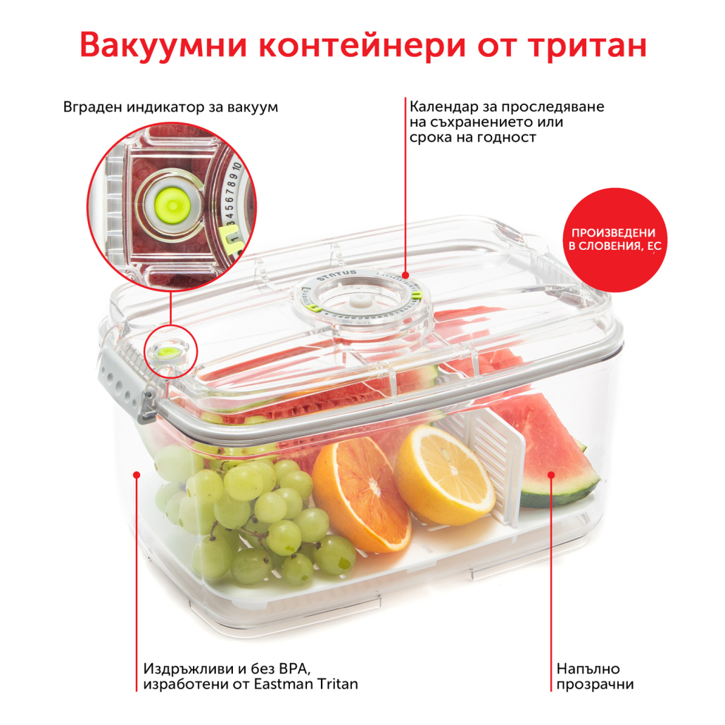 Вакуумните контейнери са подходящи за всякакви хранителни продукти. Контейнерите от Tritan не абсорбират миризми или цветове от храната.