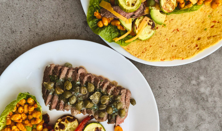 • На всяка тортила поставете лист маруля. Добавете нарязания стек, запечените зеленчуци и хрупкавия боб.
