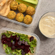 • Поставете зеленчуците (тиквички и чушки) в първата кошница на еър фрайъра и гответе за около 5-7 минути, или докато омекнат и леко се запекат.